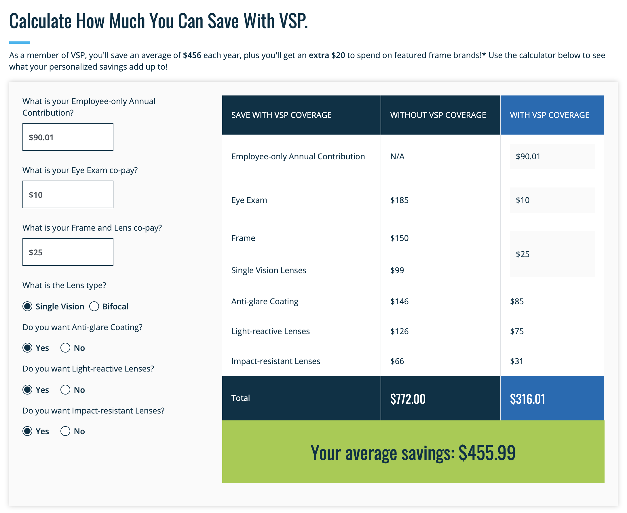 As a member of VSP, you'll save an average of $456 each year, plus you'll get an extra $20 to spend on featured frame brands!* Use the calculator below to see what your personalized savings add up to!