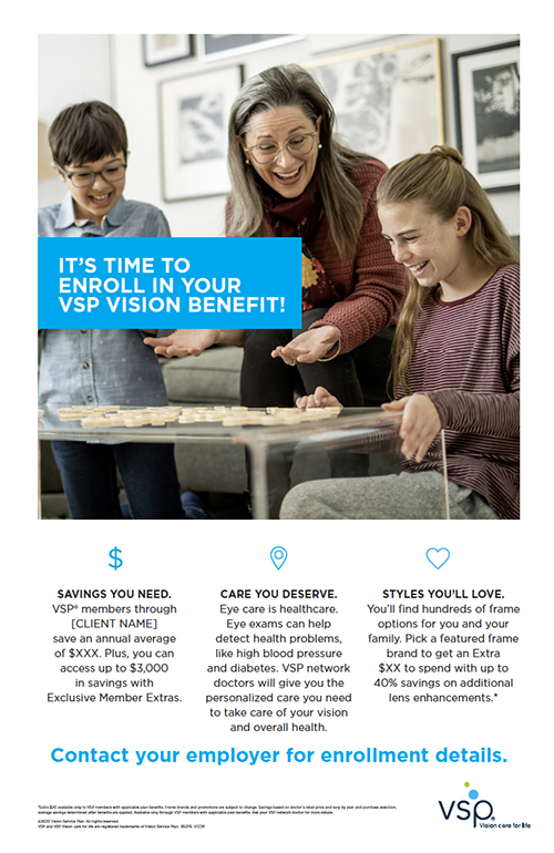 Give your employees all the reasons they should enroll in VSP Vision Care. Available as a bulletin board poster or a more detailed flyer format.
